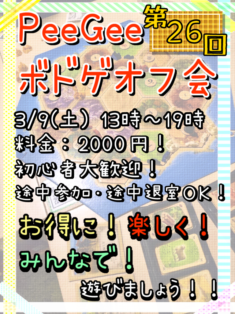 イベント 目次 最新記事 【PeeGee便り 〜駄菓子の歴史〜】 2024年2月19日 目次 【PeeGee便り 〜駄菓子の歴史〜】 数多くのボードゲームが楽しめるバー… 続きを読む 【2024年3月9日(土)13時~19時 第26回ボードゲームオフ会開催】 2024年2月13日 目次 【第26回ボードゲームオフ会開催】 皆さんこんにちは! 今回の第26回ボー… 続きを読む みんなでうまい棒祭り!お店にあるものでアレンジしてみた 2024年2月7日 目次 みんなでうまい棒祭り!お店にあるものでアレンジしてみた 駄菓子の王様、うま… 続きを読む 【2024年2月17日(土)第13回シャドウバースオフライン大会 in PeeGee】 2024年2月3日 目次 【2024年2月17日(土)第13回シャドウバースオフライン大会 in P… 続きを読む 【PeeGeeシーシャ吸い放題週間開催2/26~3/1】 2024年2月1日 【PeeGeeシーシャ吸い放題週間開催2/26~3/1】 開催期間:2月26日(… 続きを読む もう食べれない! 販売終了になった駄菓子 2024年1月26日 目次 【もう食べれない! 販売終了になった駄菓子】 実は、あの駄菓子が販売終了し… 続きを読む « 前へ 1 … 22 23 24 25 26 … 38 次へ » B! 1 LINEへ送る