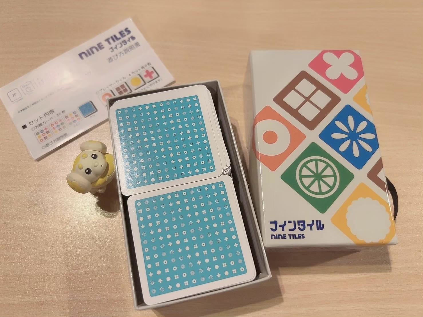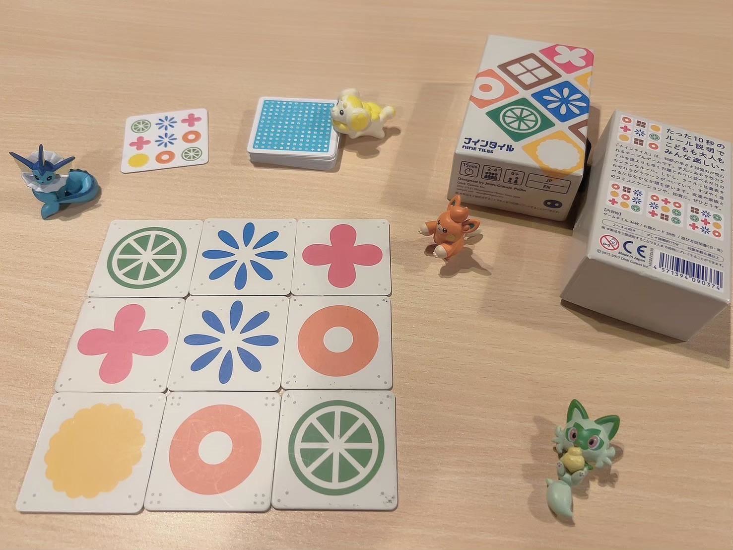 手元にある9枚のタイルをだれよりも早くお題どおりに並べるだけ。タイルには裏表それぞれちがう絵柄がかいてあり、すばやくならべるのには意外と苦労するかもしれませんよ・・・!