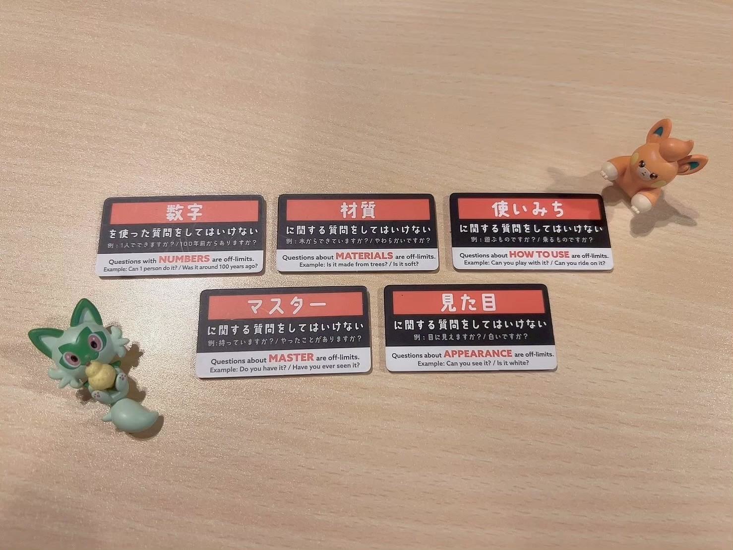 さらにさらに“NG質問カード”とやらも新登場。特定の質問を禁止にする縛りカードです。たとえば「材質に関する質問をしてはいけない」なんて縛りができちゃうと、お題が紙製なのか!鉄製なのか!プラスチック製なのかもわかりません・・・!通常ルールより難易度が上がり、推理をいっそう楽しむことができます。