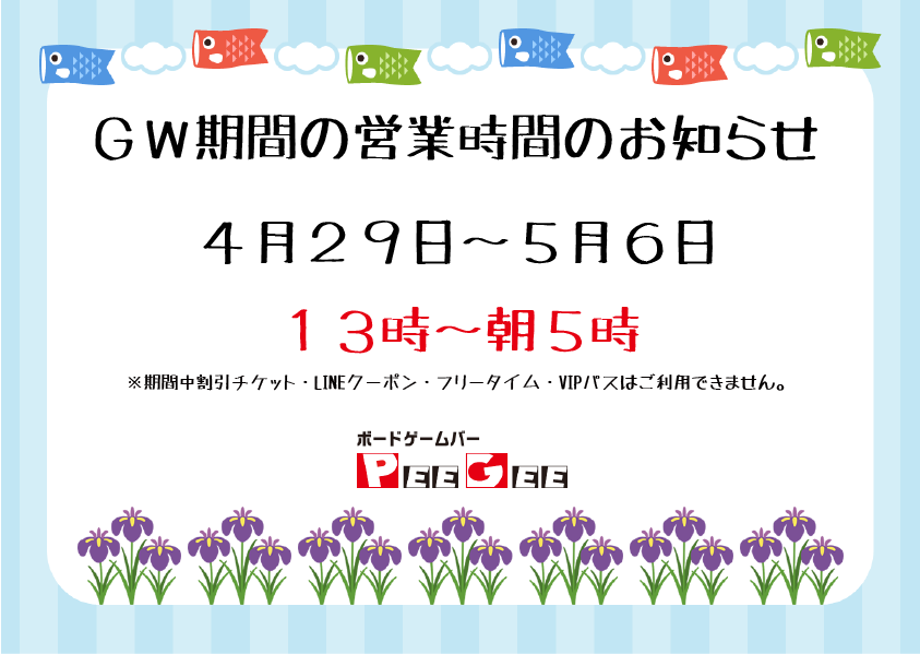 ホーム > ボードゲームバー > 【GW期間の営業時間のお知らせ】 2026/04/18 【GW期間の営業時間のお知らせ】 GW期間の営業時間は下記となりますので宜しくお願い致します。 4月29日~5月6日 13時~朝5時 ※期間中割引チケット、LINEクーポン・フリータイム・VIPパスはご利用できません。 - ボードゲームバー, お知らせ